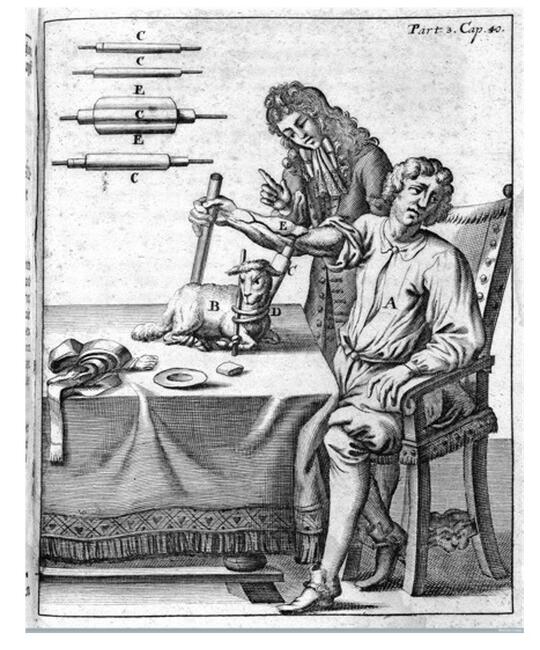 Además de descubrir una forma económica de hacer fiesta con los sabuesos, Wren inspiró al médico parisino Jean Baptiste Denis para orquestar la primera transfusión de un cordero a un reacio paciente psiquiátrico (Figura 4), seguida de la primera reacción transfusional fatal.