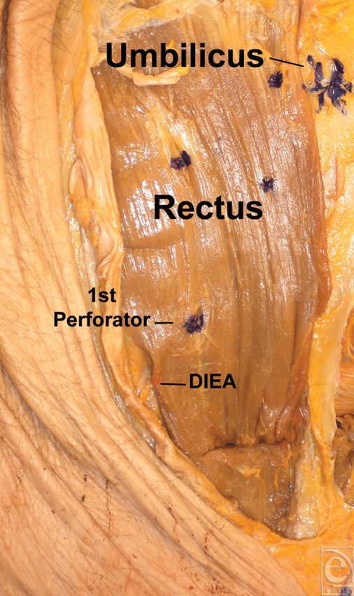 Knowledge of anatomical landmarks can aid the surgeon in more efficiently harvesting the DIEP flap. We found that using longitudinal measurements between the umbilicus and the pubic symphysis along the abdominal midline can aid clinicians in predicting the location of the DIEA and its first perforator. These measurements are coupled with distance ratios to correct for variance in patient size. We anticipate that this study will decrease the need for extensive intramuscular dissection, associated morbidities of hernia, bulge, and denervation.