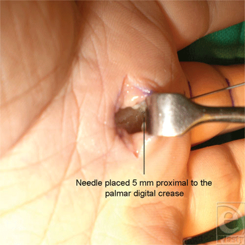 | Figure 2. Placement of a 25-gauge needle at the distal edge of the A1 pulley. |
