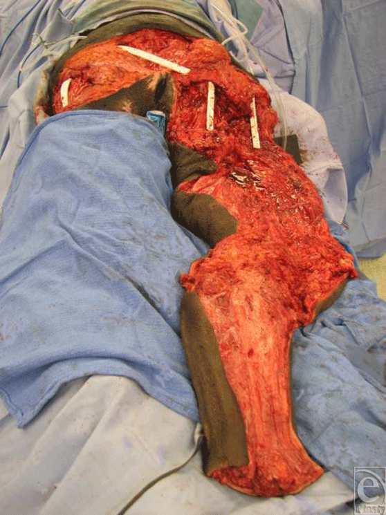 The patient is a 25-year-old woman with a history of paraplegia secondary to transverse myelitis, complicated by scoliosis and chronic vertebral osteomyelitis, who had undergone multiple previous orthopedic procedures for her spine and 2 pedicled flaps for her pressure sores. She had undergone left hip disarticulation and excision of the proximal femur for an extensive hip pressure sore. She had open wounds on the left side of the ischium and along the sacrum, which after debridement measured about 600 cm2, and were reconstructed with a left total leg fillet flap. She lost an estimated 1 L of blood and got transfused with 2 units of packed red blood cells. The flap healed well without complication with follow-up lasting 7 years.