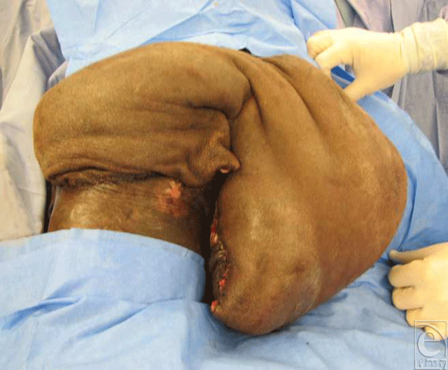 The patient is a 48-year-old man with a history of paraplegia who developed right trochanteric, sacral, and bilateral ischial pressure sores. He had previously undergone one flap surgery, which was a left gluteal V-Y advancement flap to try to cover a left ischial pressure sore. This patient underwent a right total leg fillet flap for a defect that measured about 800 cm2. He lost an estimated 1 L of blood and got transfused with 2 units of packed red blood cells. The flap~remained extremely robust postoperatively but a large portion of the undersurface did not adhere to the bed of the pressure sore. At 2 areas where there was breakdown of the wound edges, negative pressure wound therapy was applied by using the VAC® System (Vacuum Assisted Closure) (Kinetic Concepts, Inc, San Antonio, Tex) to try to close the space underneath the flap. The space did not close but never became infected and the health of the flap was never compromised. Four months later, the patient was found to have osteonecrosis of his left hip. While in the operating room for disarticulation and debridement of his left hip, our team removed some heterotopic ossification from the distal part of the flap before reinsetting it. He has had no further flap complications in the 2 years of follow-up since this revision.