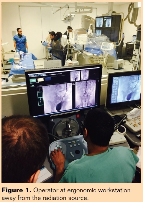 Intravascular robotics represent the latest advancement in the evolution of endovascular interventions. One of the primary objectives of this novel technology is the facilitation of guidewire and catheter navigation, especially in the setting of tortuous and challenging anatomy. A wide variety of angles and catheter shapes can be created with precision and allows the operator to utilize a single catheter to obtain stable positioning and drive interventions. The robotic system provides advantages to the physician in terms of decreasing radiation exposure and operator fatigue as the physician is comfortably seated at a workstation away from the image intensifier (Figure 1). During long arduous cases, performance may be ameliorated as the operator is less prone to fatigue. Although we are in the learning curve with this technology, there is the potential to increase procedural efficiency with continued technical improvements.