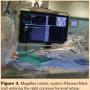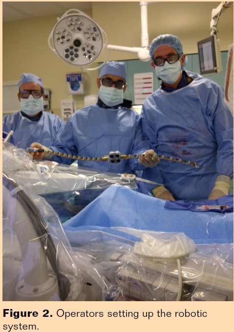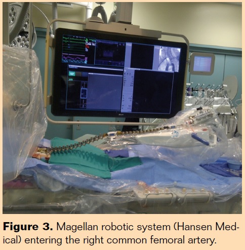 Our experience with vascular robotics began in 2012, very soon after we acquired the Magellan robotic system (Hansen Medical) at Miami Cardiac and Vascular Institute (Figures 2 and 3). We have performed a variety of interventions utilizing the Magellan robot, including embolization, carotid stenting, mesenteric stenting, treatment of peripheral arterial disease, endovascular aneurysm repair, and treatment of renal aneurysms. With regard to interventional oncology, we have utilized the robotic catheter to assist with hepatic chemoembolization and yttrium-90 radioembolization.