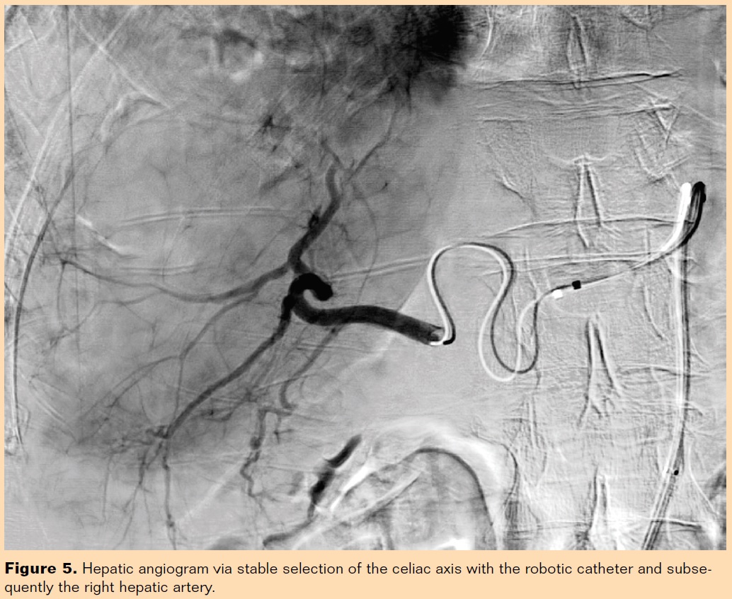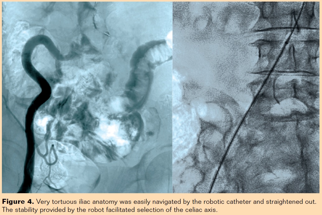 The robotic catheter can be especially helpful in the setting of very tortuous aortoiliac anatomy with significant angulation of the celiac axis or superior mesenteric artery that can make manual catheterization difficult or impossible. Although these represent a minority of cases, such cases sometimes necessitate utilization of an upper-extremity approach. The robotic catheter allows for excellent stability from a femoral approach, enabling stable catheterization of targeted vessels because of the ability to manipulate the catheter into different shapes and angles (Figures 4 and 5).