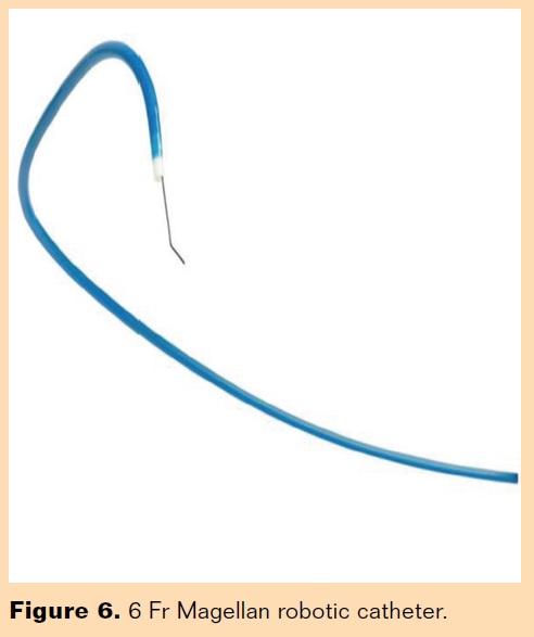We have not encountered any complications with robot-assisted hepatic embolization procedures. In fact, we have not encountered any complications with the robot for any vascular procedure. Prior to the FDA clearance of the 6 Fr robotic catheter (Figure 6), we performed chemoembolization with the 9 Fr catheter. The clearance of the 6 Fr catheter was a significant advancement as it allowed the procedure to be performed via a smaller profile 6 Fr sheath, which is the size catheter that we generally use. Although we did not encounter any groin complications when utilizing a 9 Fr sheath, the smaller 6 Fr catheter is likely safer. The 6 Fr robotic catheter is designed to catheterize and intervene in smaller vessels. Robotic catheterization is currently limited for smaller vessels for which the smaller 6 Fr system is often still too large and often requires delivery of a microcatheter through the robotic system. Hansen Medical is currently investigating smaller catheters that would be valuable in selecting and tracking into smaller vessels in this setting. We are excited about the future of robotic-guided microcatheters, which will further increase the utility of this system for embolization procedures as well as other peripheral interventions.