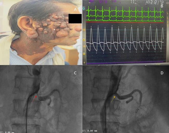On examination, his BP was 220/100 mm Hg and his heart rate was 90 beats per minute. Multiple cutaneous neurofibromas and areas of hyperpigmentation were noted over his face and neck (Figure A). Electrocardiography demonstrated normal sinus rhythm with evidence of left ventricular hypertrophy. Transthoracic echocardiography revealed concentric left ventricular hypertrophy with preserved systolic function, without evidence of aortic coarctation or stenosis. Laboratory investigations showed elevated serum creatinine (1.7 mg/dL; normal 0.6-1.1 mg/dL).