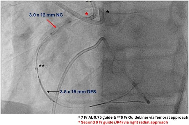 Video 1. Successful passage of a 3.5 x 15-mm drug-eluting stent using modified “tunnel-in-landslide” technique (TILT).