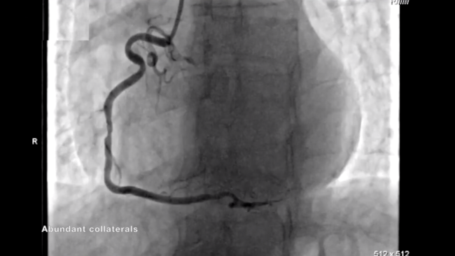 A 60-year-old male with chronic obstructive pulmonary disease and active smoking was admitted for positive treadmill test. He reported exertional chest pain 4 months ago; however, since then he had been symptom free. Echocardiography showed severe anteroseptal and mild inferoposterior hypokinesia, preserved wall thickness, and moderately reduced left ventricular ejection fraction. Coronary angiography revealed non-calcified chronic total occlusion (CTO) of the left main (LM) with microchannel toward the left circumflex (CX) artery.