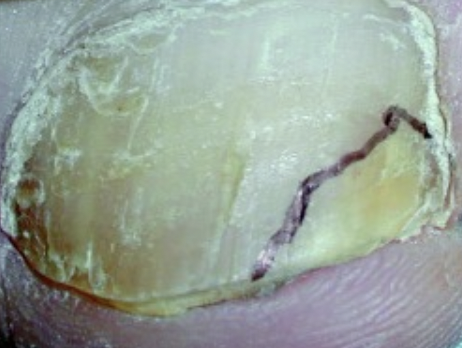 The earliest published report (in 2022) described a case of successful clearance of a fungal nail spike within the hallux nail. The diagnosis was confirmed using a PreventID® dermatophyte test strip (Preventis GmbH, Germany) where the patient underwent a total of 6 treatments of microwave therapy over the course of 20 months, at which point the nail was visually cleared of fungal infection.7