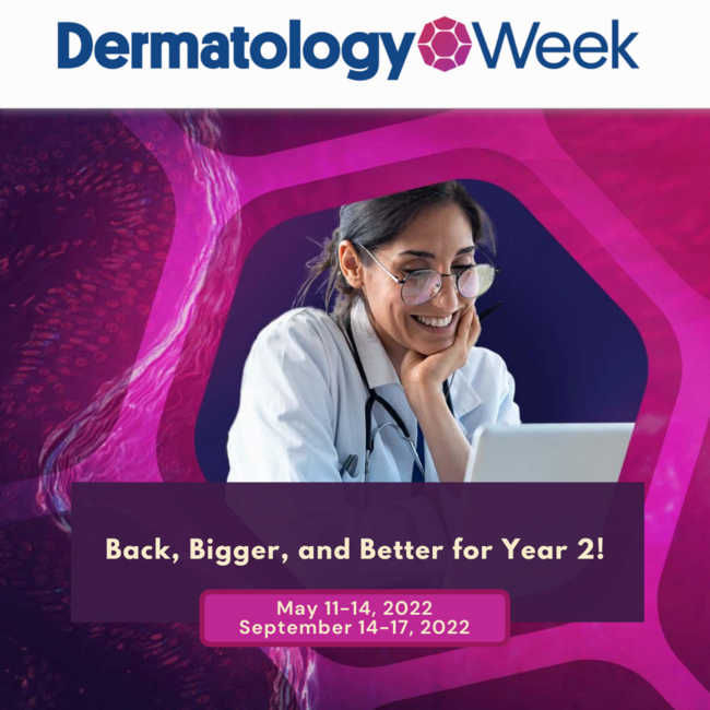 Dermatology Week returns May 11-14, 2022, after a successful inaugural year with countless dermatology experts presenting and providing practical dermatology education for today’s providers. This is a virtual event spanning over 4 days with informative lectures, Q&As, and networking opportunities.