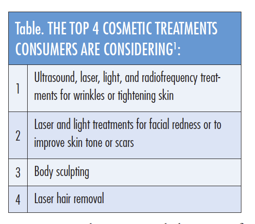 The survey identified the top 4 treatments (Table) and the percentage of consumers considering them. The treatments include ultrasound, laser, light, and radiofrequency (RF) treatments for smoothing wrinkles or tightening skin (60%); laser and light treatments for facial redness or to improve skin tone or scars (51%); body sculpting (50%); and laser hair removal (48%).