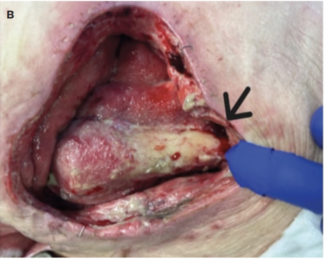 When standard treatment methods for cavity, undermining, or tunneling wounds are unsuccessful, it may be necessary to consider more invasive reconstructive methods.7,8 Reconstruction often necessitates extensive operations for tunnel marsupialization and/or rotational or free flaps.7,8 Often patients are sarcopenic and malnourished, leading to complications or poor outcomes, including amputation.9 A synthetic electrospun fiber matrix (SEFM) (Restrata; Acera Surgical, Inc) could be considered in the management of undermining, tunneling, and cavity wounds. The SEFM is engineered to mimic native extracellular matrix and thus encourage tissue ingrowth in the form of fibroblast migration, proliferation, and subsequent neovascularization.10,11